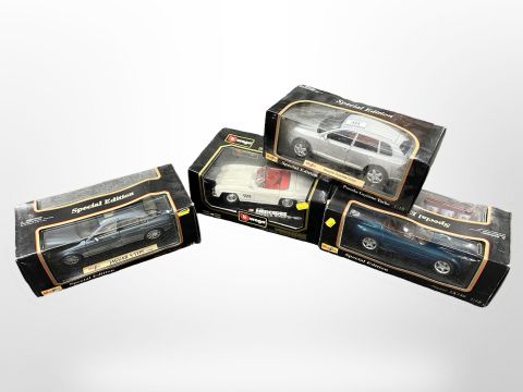 Three Maisto 1:18 scale die-cast vehicles, and a further Burago vehicle.