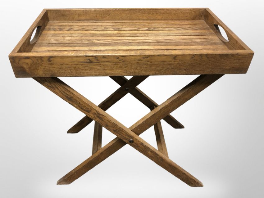 An oak butler's tray table on X-frame stand, width 60cm.