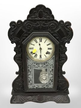 A carved and ebonised gingerbread clock, height 57cm.