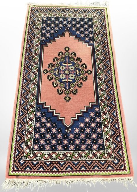 A Caucasian rug on pink ground, 162cm x 82cm.