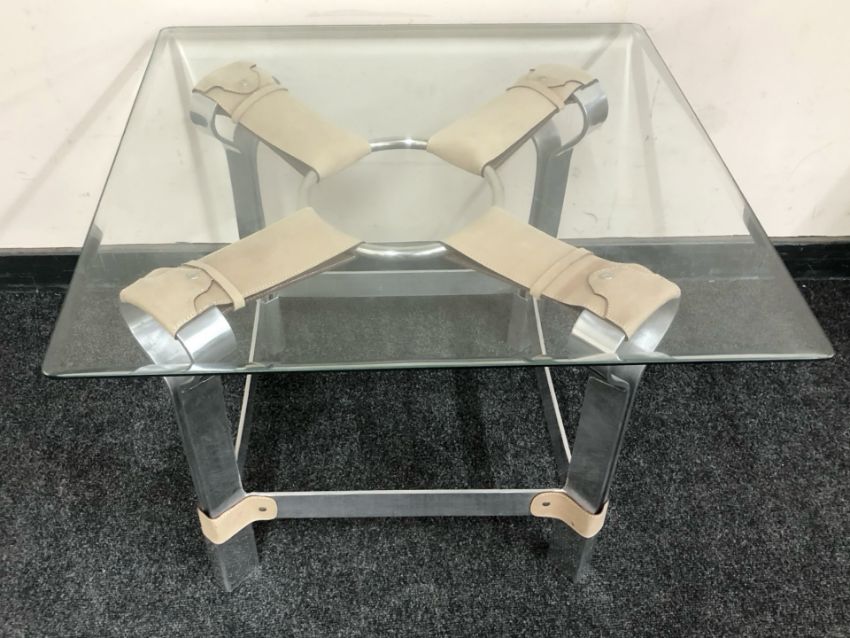 A pair of contemporary square bevel glass rectangular lamp tables on chrome and stitched tan leather support, 71 cm x 52 cm x 71 cm