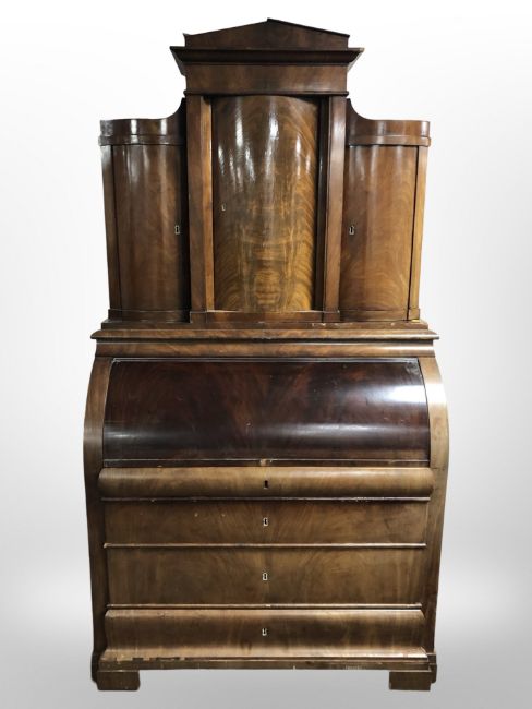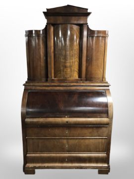 A 19th-century continental mahogany cylinder-front secretaire bureau, 117cm wide x 60cm deep x 212cm high.