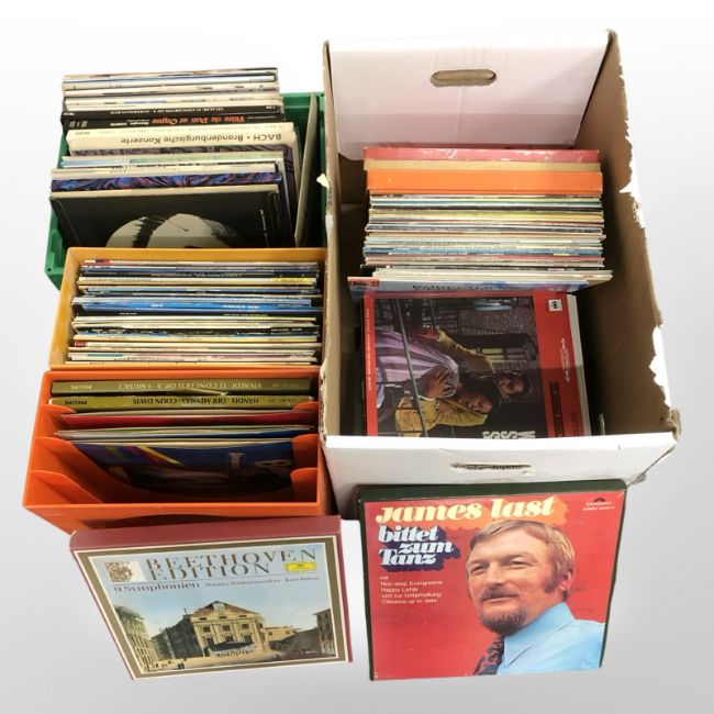 A quantity of vinyl LP records and box sets, continental pieces and other mixed titles, classical, Boney M, etc. (2 boxes)