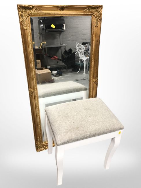 A reproduction gilt framed mirror, length 100 cm and a stool