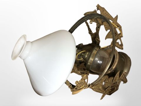 A Scandinavian brass pendant light fixture with opaque conical glass shade and a quantity of opaque and clear light shades. (2 boxes)