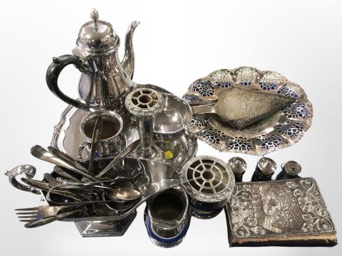 A group of silver and silver plate to include a Victorian Holy Bible with embossed silver front cover, silver-plated tea service, salver, cutlery, etc.