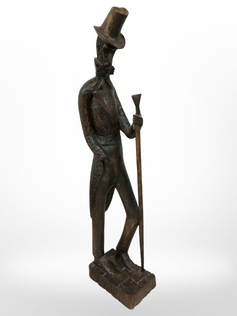 A hand-carved wooden figure of The Slim Man in top hat holding staff, height 42cm.