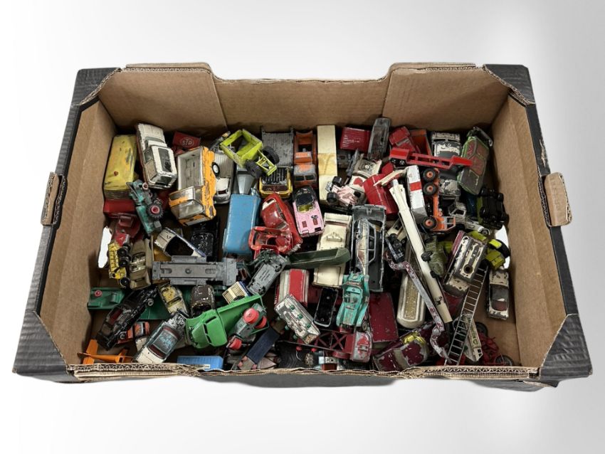 A collection of vintage play-worn diecast vehicles, Dinky, Corgi etc (1 box)