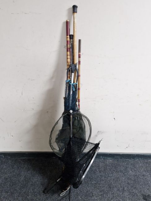A bundle of two piece fishing rods and landing nets
