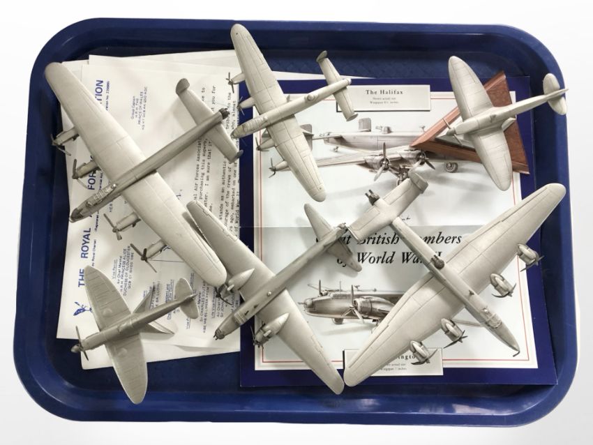A group of die-cast metal scale model World War II aircraft including Spitfire, Halifax Bomber, etc.