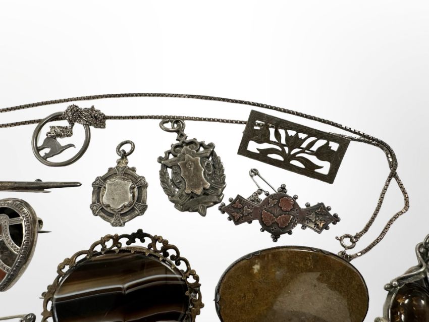 A good collection of antique and later brooches, Scottish agate examples, sterling silver, silver pendant on chain, antique silver fobs etc