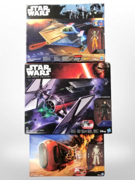 Three Hasbro Disney Star Wars figurines, Rey's Speeder (Jakku), Hera Syndulla's A-Wing, Tie Fighter, boxed.