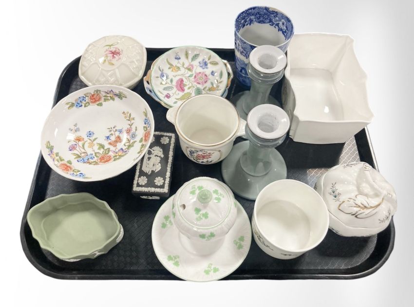 A Shelley preserve pot and dish, Wedgwood Jasperware trinket boxes, Aynsley pedestal bowl, pair of earthenware candlesticks, Minton lidded pot etc