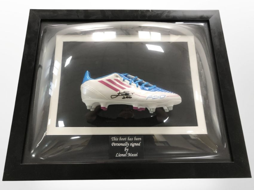 A framed football boot signed by Lionel Messi with certificate of authenticity, overall 60 cm x 50 cm