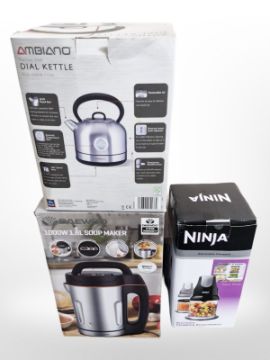 Six boxed home appliances including kettle, Krups coffee grinder, Blaupunkt oil radiator etc