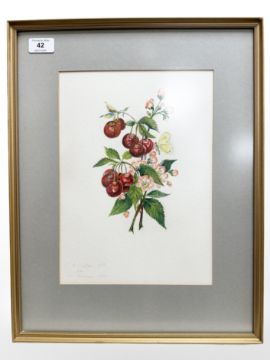 Dame Catherine Cookson OBE (British, 1906-1998) Still life of cherries, after E L Bateman, watercolour and pencil, 34cm by 25cm.