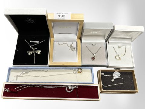 Seven silver pendants on chains, some set with gemstones.