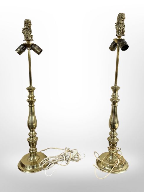 A pair of 20th century Scandinavian brass lamp bases with armorial lion finials, height 87 cm (continental wiring)