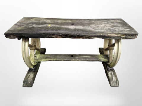 A weather teak outdoor table on gilt metal cartwheel supports, length 135 cm