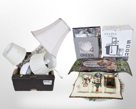 A group of contemporary table lamps, kitchen juicer, home wares (3 boxes)