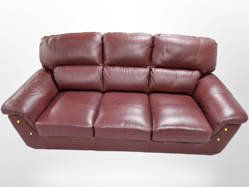 A contemporary Burgundy leather three seater settee, 196 cm x 92 cm x 86 cm