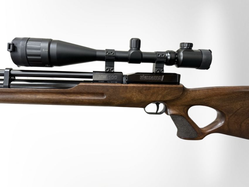 A Weihrauch HW100T .22 calibre PCP repeating air rifle, serial number 1918329, with HD scope, Weihrauch silencer, two internal magazines, pressurised air container, and manual, in soft carry bag.