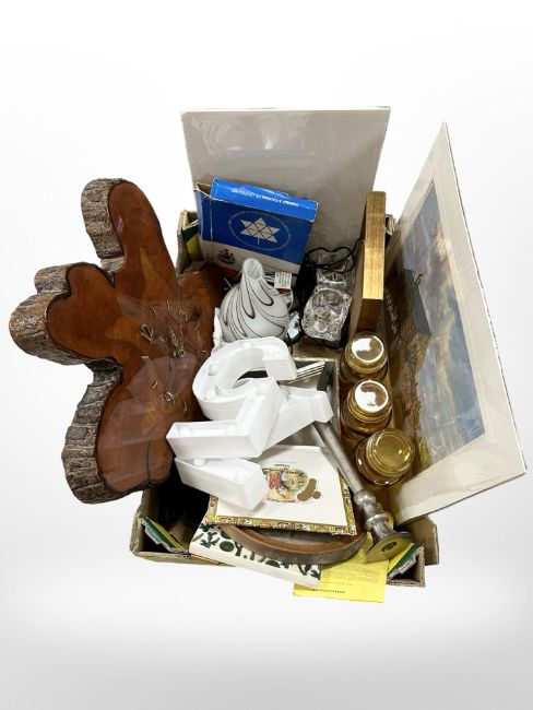 A contemporary burr wood quartz wall clock, other home wares, glass and silver plated items, pictures etc