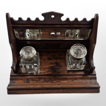 A Victorian oak desk stand with two ink wells, width 25 cm