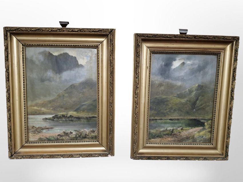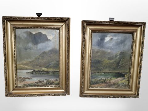 19th-century school : A pair of Highland loch scenes, oil on canvas laid to board, each 34cm x 24cm.