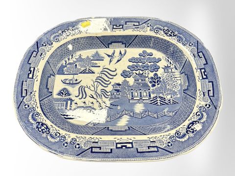 A blue and white transfer-printed willow pattern meat plate, width 46cm.
