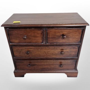 A reproduction mahogany three-drawer apprentice chest, width 28cm.