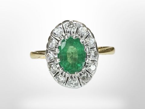 An antique 18ct gold emerald and diamond cluster ring, size O.