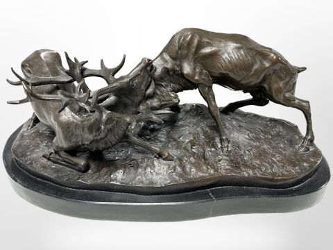 After Pierre-Jules Mêne, a bronze group of two stags locking antlers on black marble plinth, 44cm wide.