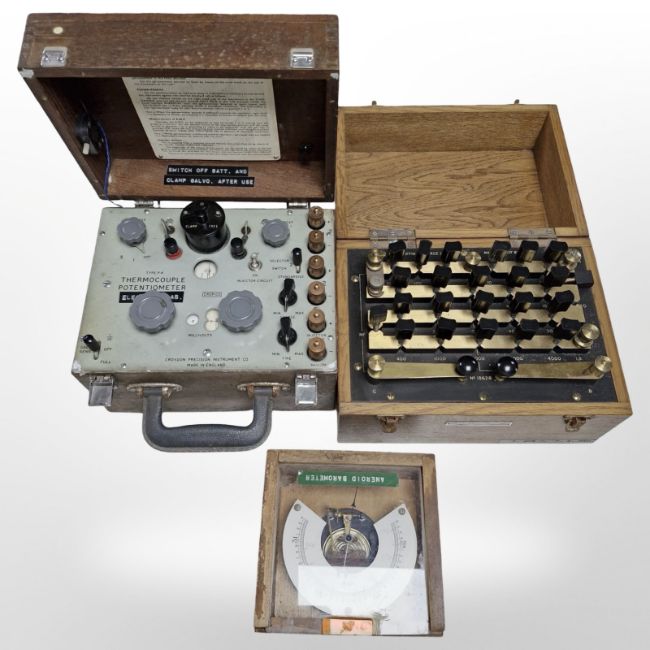 An Aneroid barometer, a Croydon Precision Instrument Company thermo couple potentiometer and a Griffin and George Limited resistance bridge box.
