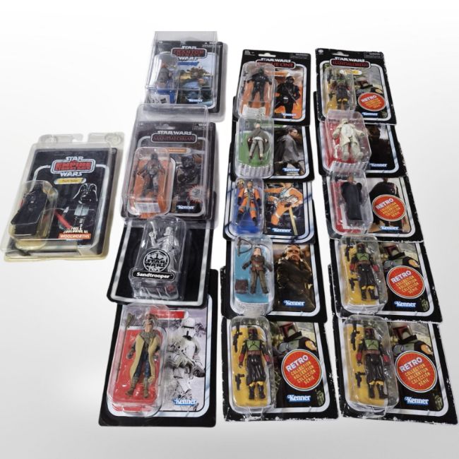 15 Kenner Star Wars figurines including The Empire Strikes Back, The Phantom Menace, The Mandalorian, etc., boxed.