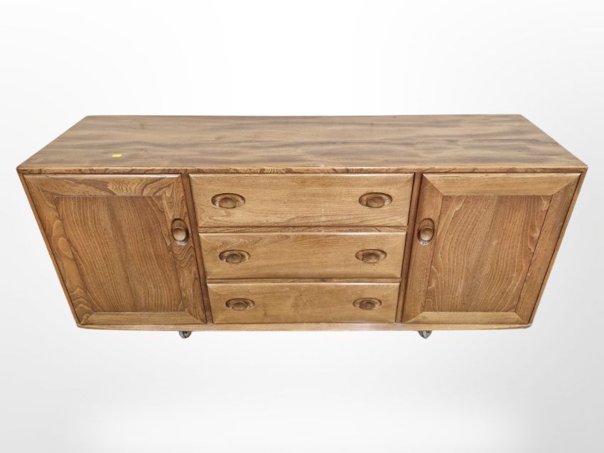 An Ercol elm low sideboard on castors, 155 cm x 44 cm x 69 cm