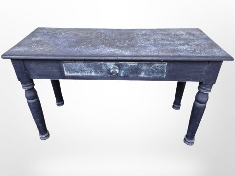 A pine single drawer table with later scummbled painted finish, 130 cm x 50 cm x 77 cm