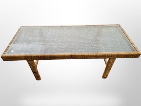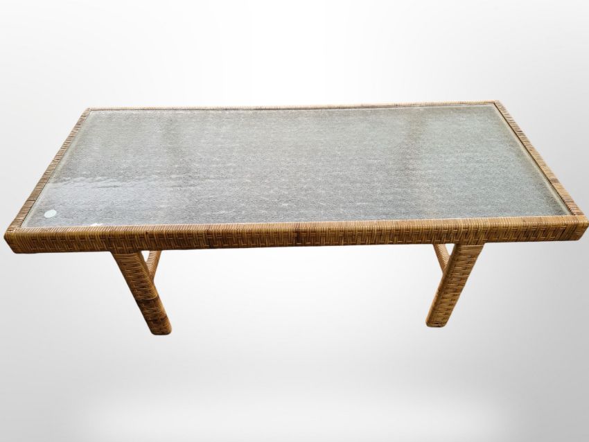 A cane and glass topped rectangular coffee table, three wicker chairs, stool and a basket