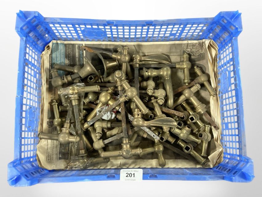 A crate of vintage brass door handles
