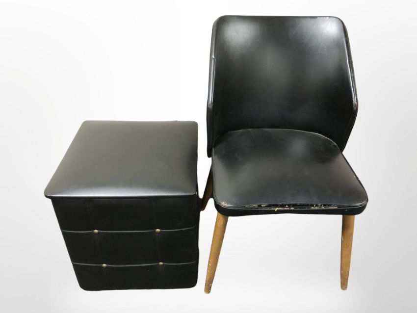 A black vinyl storage cube stool and similar chair