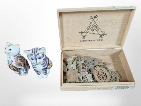 Two Royal Crown Derby seated cat paperweights, one gold stopper and one silver, together with a cigar box containing assorted military cap badges, etc.