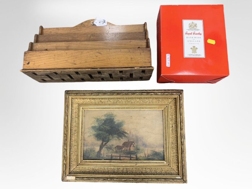An Edwardian correspondence rack, with four compartments, suitable for desk standing or wall mounting, width 39 cm, height 24 cm, depth 14 cm, together witha gilt-framed oil painting on panel depicting a country dwelling, circa 1900, 17 cm x 26 cm, framed, as well as a Royal Brierley cut-glass rose bowl, complete with chrome inset, boxed. (3)