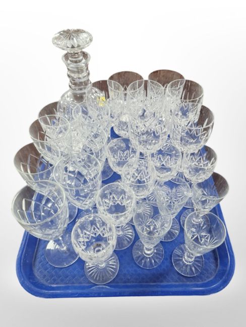 A group of lead crystal wine glasses, tumblers, decanter etc, some Stuart crystal etc