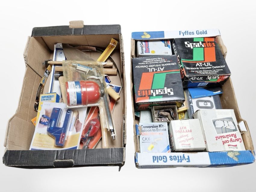A group of hand tools, home security detectors and other items, all in retail packaging or unused condition. (2 boxes)