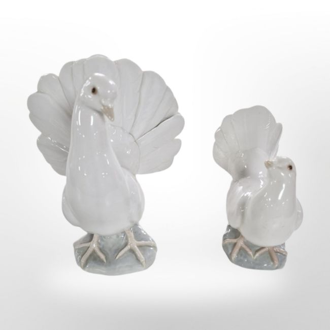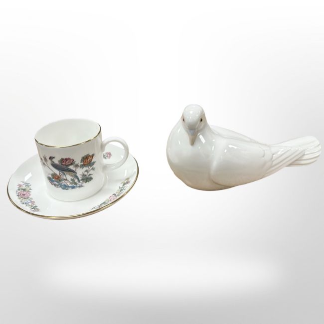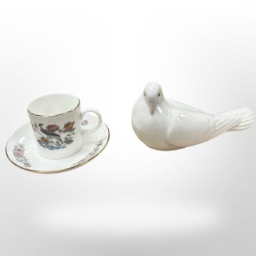 Two Lladró doves, No. 1015 and 1016, both boxed, together with a Nao dove and a Wedgwood Kutani coffee cup and saucer