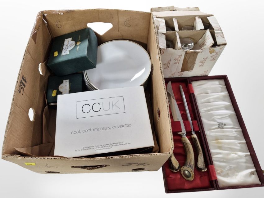 An antler-handled carving set, set of six Rosenthal crystal wine glasses, crystal decanter, silver-plated vase, and two boxed pieces of Minton porcelain. (1 box)