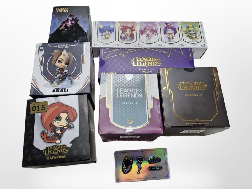 A group of Riot Games League of Legends figurines and related collectibles, all boxed.