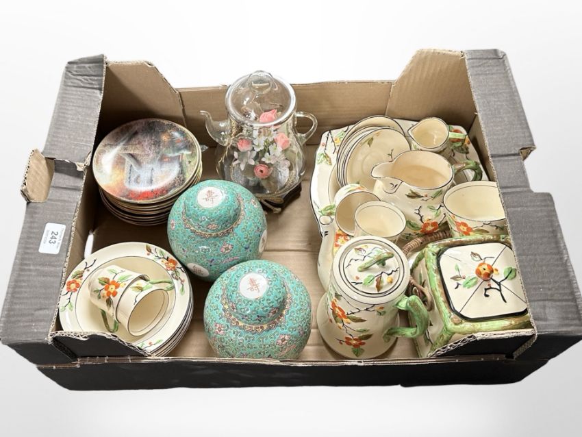 A quantity of ceramics including Bradford Exchange, Thomas Kinkade collector's plates, dinner wares, 20th-century Chinese turquoise-glazed ginger jars, and a diorama in glass surround. (1 box)