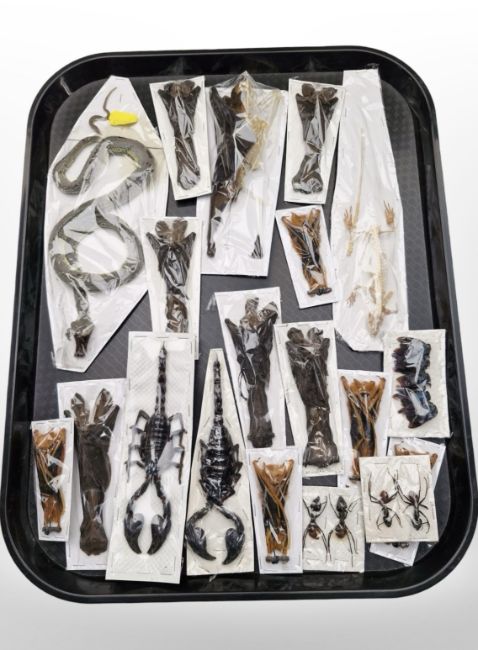A group of bat, scorpion, insect, snake, specimens, etc., all laid to card.