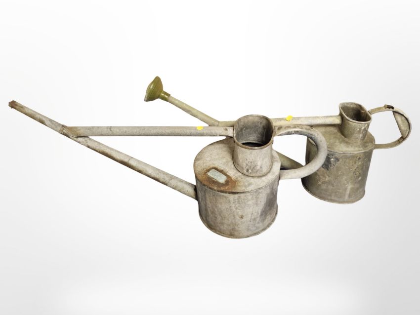 Two galvanized watering cans